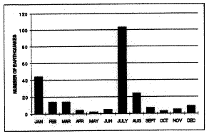 Two hundred thirty-five earthquakes were located near Monticello Reservoir during 1997. They all had a ML less than 2.0 with the largest even having a magnitude ML = 1.9. Most of the events were located within the reservoir between stations MR10 and MR01. Except for two events, all the other depths were 4 km or shallower The monthly distribution of the earthquakes around Monticello Reservoir is given in the following graph: